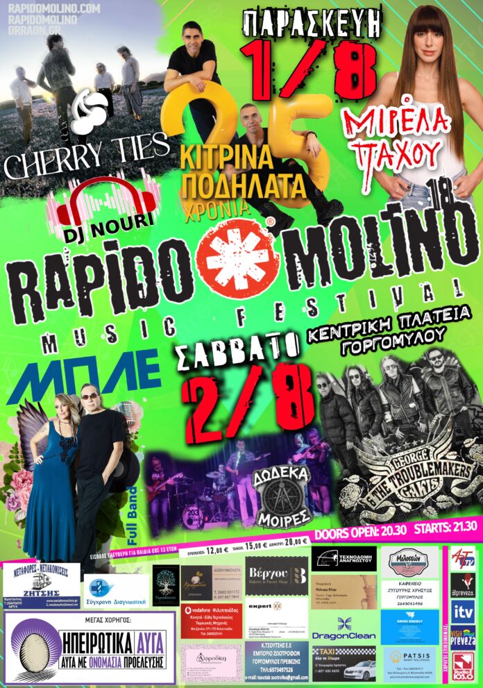 Το αγαπημένο φεστιβάλ Rapido Molino επιστρέφει δυναμικά για 18η χρονιά και θα πραγματοποιηθεί στις 1 και 2 Αυγούστου, στην κεντρική πλατεία του Γοργομύλου Πρεβέζης. Το φεστιβάλ υπόσχεται να χαρίσει αξέχαστες μουσικές εμπειρίες με εξαιρετικούς καλλιτέχνες και συγκροτήματα.