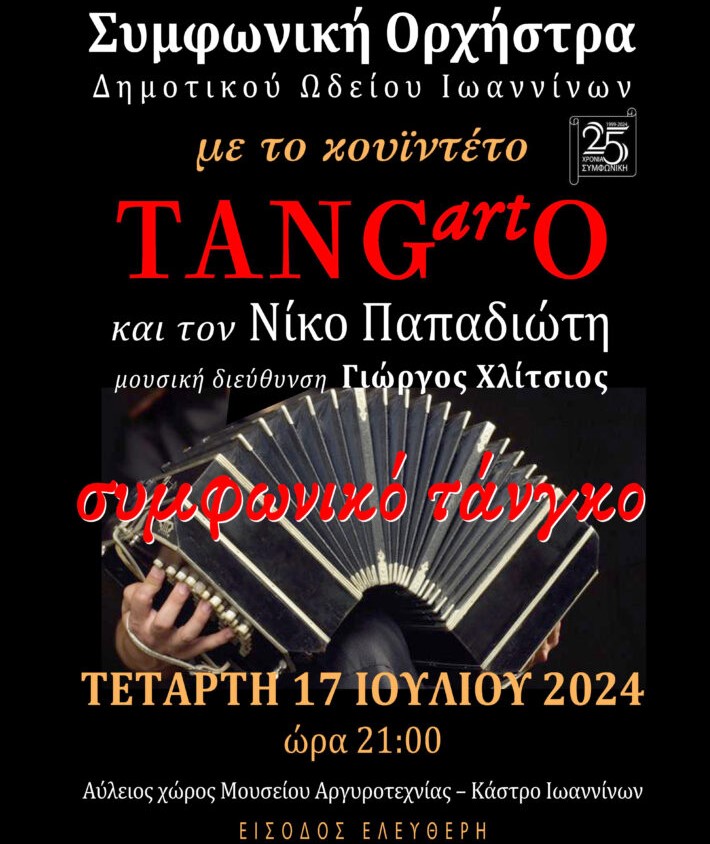 Το κουιντέτο TANGartO και η Συμφωνική Ορχήστρα του Δημοτικού Ωδείου Ιωαννίνων συμπράττουν σε μία συναυλία με τον τίτλο «συμφωνικό τάνγκο», την Τετάρτη 17 Ιουλίου στις 21:00, στον αύλειο χώρο του Μουσείου Αργυροτεχνίας.