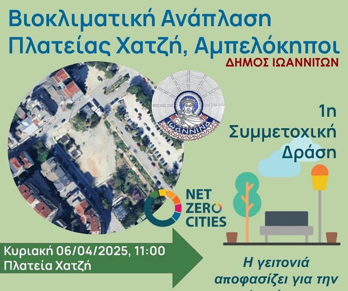 Κάλεσμα στους κατοίκους της περιοχής των Αμπελοκήπων να συμμετάσχουν στην πρώτη συμμετοχική δράση για τη βιοκλιματική ανάπλαση της Πλατείας Χατζή, απευθύνει ο δήμος Ιωαννιτών.