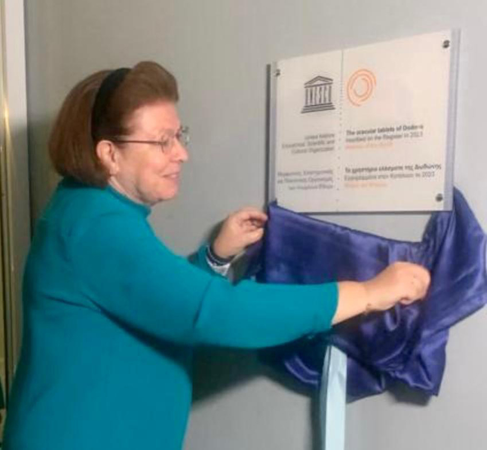 Η Λίνα Μενδώνη ανέλυσε το ρόλο του Διεθνούς Ευρετηρίου της UNESCO «το οποίο αποσκοπεί στη διαφύλαξη της καταγεγραμμένης και τεκμηριωμένης κληρονομιάς της ανθρωπότητας, ώστε αυτά τα αγαθά να ξεπεράσουν τη λήθη, να υπερβούν τη φθορά και να αναδειχθούν σε κοινό κτήμα της ανθρωπότητας, μέσω της διασφάλισης της ανοιχτής προσβασιμότητάς τους. Η συγκεκριμένη εγγραφή αφορά σε 4.126, λεπτά και εύθραυστα ενεπίγραφα φύλλα μολύβδου, πάνω στα οποία χαράσσονταν τα ερωτήματα των προσκυνητών του ιερού και του μαντείου της Δωδώνης, καθώς και οι απαντήσεις που δίνονταν από το θεό Δία και τη συλλατρευόμενή του, Διώνη. Τα ελάσματα μαρτυρούν, στην ουσία, την διαχρονική αγωνία του απλού ανθρώπου, που αναζητά τη βεβαιότητα για τις πράξεις και την ίδια του την ύπαρξη στο θεό του και χρονολογούνται με βάση τη γραφή τους, από τα τέλη του 6ου αι. π.Χ. έως τα μέσα του 2ου αι. π.Χ. Ο κύριος όγκος τους ανακαλύφθηκε διάσπαρτος εντός του τεμένους της Δωδώνης στις ανασκαφές των ετών 1929-1935 και 1952-1959 και φυλάσσεται στο Αρχαιολογικό Μουσείο των Ιωαννίνων».