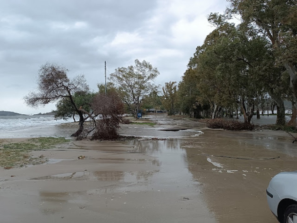 Η κυκλοφορία οχημάτων από το Δρέπανο προς το Μακρυγιάλι είναι αδύνατη, καθώς ο δρόμος βρίσκεται κάτω από τα νερά.
