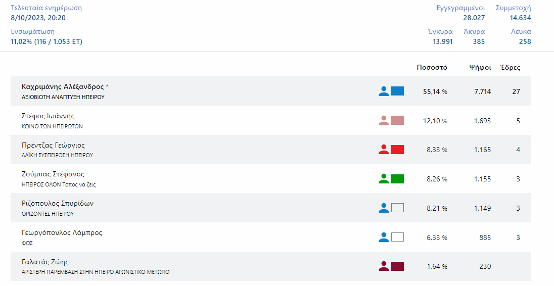 Σε ποσοστό 5,13% (54 / 1.053 ΕΤ) της ενσωμάτωσης τα αποτελέσματα των περιφερειακών εκλογών της Ηπείρου έχουν ως εξής: