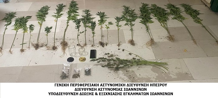 Από την έρευνα που ακολούθησε στο σπίτι του βρέθηκαν και κατασχέθηκαν δεκαεννιά δενδρύλλια κάνναβης, ύψους 50 έως 120 εκατοστών, που καλλιεργούσε στον αύλειο χώρο, επτά κορυφές δενδρυλλίων κάνναβης προς αποξήρανση και μικροποσότητα ακατέργαστης κάνναβης. Ο συλληφθείς θα οδηγηθεί στον κ. Εισαγγελέα Πλημμελειοδικών Ιωαννίνων.