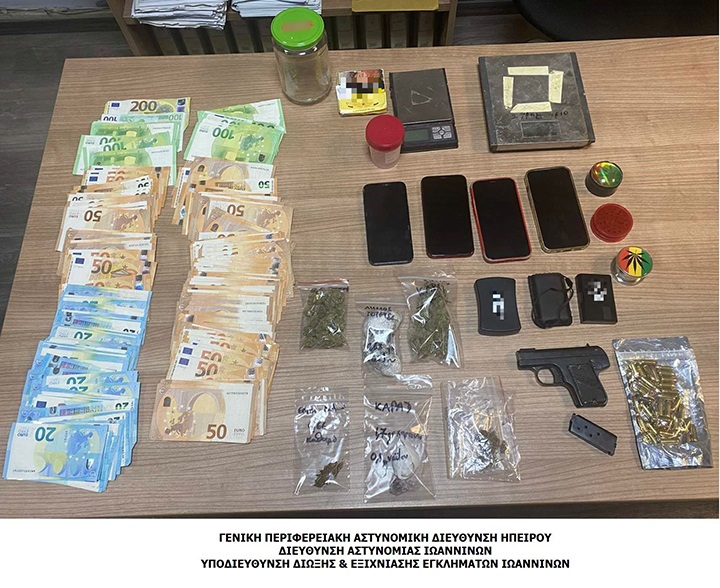Επιπλέον, στο πλαίσιο της ίδιας υπόθεσης, συνελήφθη ημεδαπός συνεργός τους, με την κατηγορία της κατοχής ναρκωτικών. Αναλυτικότερα, όπως προέκυψε από την αστυνομική έρευνα, η οποία περιλάμβανε τόσο φυσικές όσο και τεχνικές μεθόδους, οι τρεις κατηγορούμενοι, τουλάχιστον από τον Σεπτέμβριο του τρέχοντος έτους, είχαν ενωθεί με σκοπό τη διακίνηση ακατέργαστης κάνναβης και κοκαΐνης σε χρήστες της ευρύτερης περιοχής των Ιωαννίνων, αποκομίζοντας οικονομικά οφέλη. Στο πλαίσιο των ερευνών, που ακολούθησαν των συλλήψεων, βρέθηκαν στα σπίτια και σε χώρους εργασίας τους, συνολικά, τα εξής συσκευασίες με ακατέργαστη κάνναβη, συνολικού βάρους 42,5 γραμμαρίων, πιστόλι με γεμιστήρα κενό φυσιγγίων, 40 φυσίγγια, χρηματικό ποσό 10.220 ευρώ, 3 ζυγαριές ακριβείας, 2 τρίφτες κάνναβης, διάφορες νάιλον συσκευασίες, κενές περιεχομένου και 4 κινητά τηλέφωνα.
