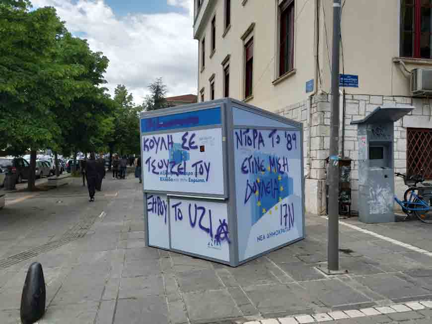 «Θύμα» βανδαλισμού έπεσε το προεκλογικό περίπτερο της Νέας Δημοκρατίας που βρίσκεται στην Κεντρική Πλατεία των Ιωαννίνων. Άγνωστοι δράστες έγραψαν με σπρέι συνθήματα για τη «17 Νοέμβρη» και τη μη παραχώρηση άδειας στον Δημήτρη Κουφοντίνα.