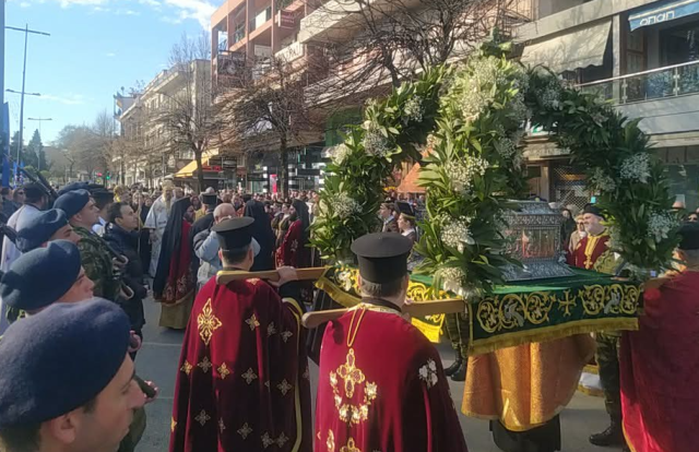 Χθες, Σάββατο, ανήμερα της εορτής, τελέστηκαν από νωρίς το πρωί ο Όρθρος και η Θεία Λειτουργία τόσο στον Ιερό Ναό Αγίου Γεωργίου όσο και στον Σεπτό Οίκο. Στη συνέχεια πραγματοποιήθηκε η καθιερωμένη λιτάνευση των Ιερών Λειψάνων στο κέντρο της πόλης, παρουσία πλήθους πιστών, με την πομπή να ολοκληρώνεται με την εναπόθεσή τους στον Μητροπολιτικό Ναό.