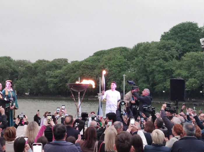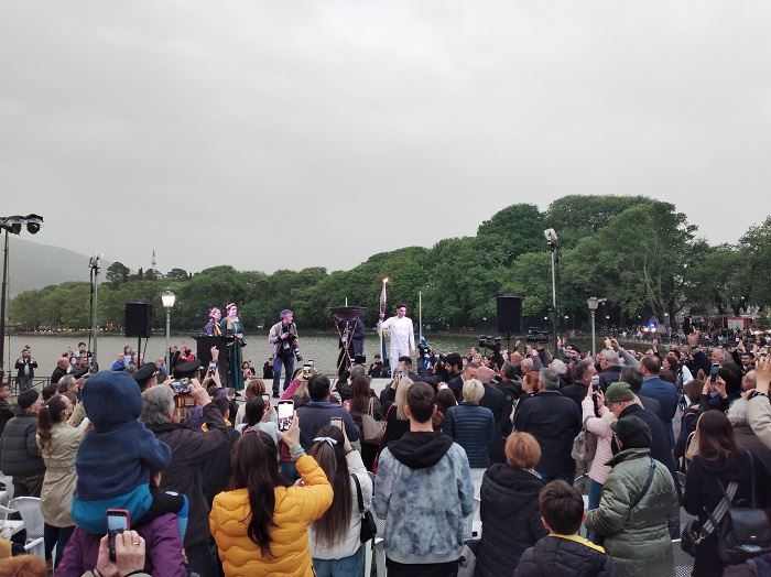 Υπό τα θερμά χειροκροτήματα εκατοντάδων παρευρισκομένων ο Νέστορας Κολιός άναψε το βωμό που φώτισε την παραλίμνια περιοχή και ακολούθησε στη συνέχεια η ανάκρουση του ολυμπιακού ύμνου, καθώς επίσης των εθνικών ύμνων της Γαλλίας και της Ελλάδας αντίστοιχα.
